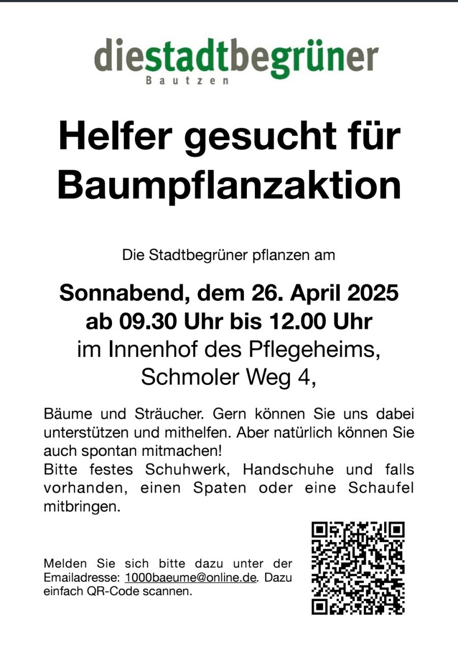 Wir suchen Helfer für eine Baumpflanzaktion im Pflegeheim Seidau, Schmoler Weg 4 in Bautzen. Es werden Bäume und Sträucher gepflanzt. Bitte festes Schuhwerk, Handschuhe und, falls vorhanden, Spaten oder Schaufel mitbringen. Wenn möglich vorher anmelden unter 1000baeume@online.de oder ganz spontan vorbeikommen. Vielen Dank.