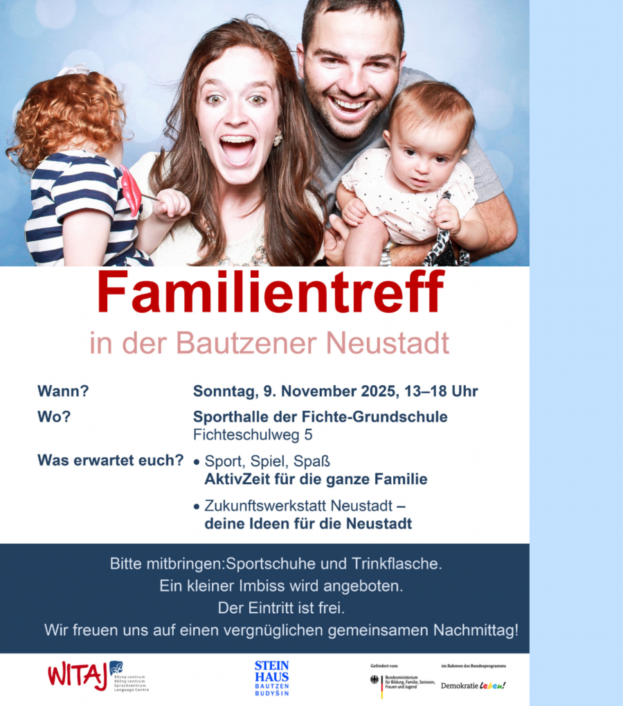 Der Familientreff ist ein gemeinsames Projekt vom WITAJ-Sprachzentrum und vom Steinhaus e.V., bei dem ihr euch auf einen abwechslungsreichen Nachmittag voller Sport, Spiel & Spaß freuen könnt!