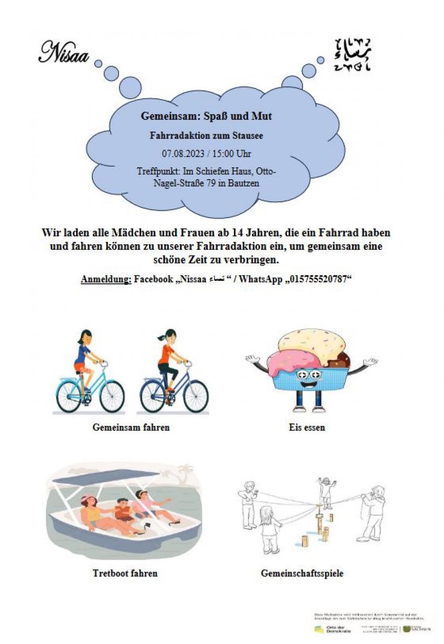 Wir laden alle Mädchen und Frauen ab 14 Jahren, die ein Fahrrad haben und fahren können zu unserer Fahrradaktion ein, um gemeinsam eine schöne Zeit zu verbringen. Anmeldung: Facebook „Nissaa نساء “ / WhatsApp „015755520787“