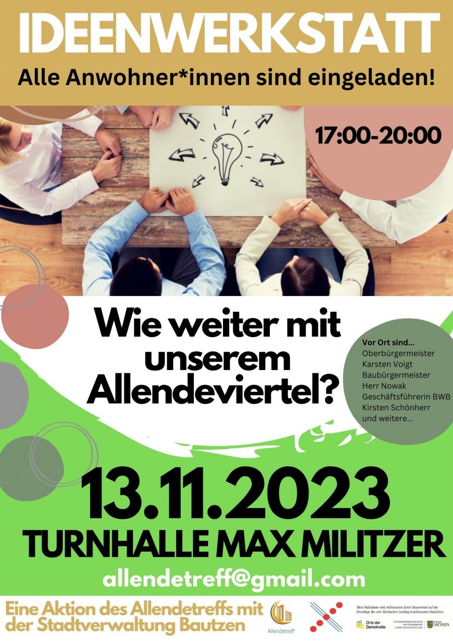 Am 13.11.2023 von 17.00-20.00 Uhr findet in der Turnhalle Max Militzer eine Ideenwerkstatt in Bautzen im Allendeviertel statt. Hier haben alle die Möglichkeit, Fragen an die Bürgermeister und Wohnungsbaugesellschaften zu stellen und eigene Ideen und Wünsche für das Allendeviertel einzubringen. Mitmachen und Mitgestalten ist angesagt! Für Essen und Getränke ist gesorgt. Diese Aktion wird vom Allendetreff organisiert. Kommt vorbei und lasst uns gemeinsam unser Allendeviertel gestalten und verbessern. Wir alle wollen in einem lebenswerten und attraktiven Viertel leben. Deshalb ist es wichtig, dass wir uns aktiv daran beteiligen, wie unser Allendeviertel gestaltet wird. In der Ideenwerkstatt haben Sie die Möglichkeit ihre Stimme zu erheben und ihnen Gehör zu verschaffen. Die Bürgermeister und Wohnungsbaugesellschaften stehen für Ihre Fragen bereit und sind offen für neue Anregungen zur Verbesserung des Viertels. Doch auch Sie sind gefragt! Bringen Sie ihre eigenen Ideen ein, teilen Sie uns mit, was Ihnen am Herzen liegt oder welche Veränderungen Sie gerne sehen würdet. Gemeinsam können wir etwas bewegen – seien Sie dabei! Der Allendetreff organisiert diese Aktion aus Überzeugung dafür, dass jeder Einzelne einen Beitrag dazu leisten kann, um das Leben im Allendeviertel noch schöner zu machen. Lasst uns gemeinsam anpacken: Kommen Sie vorbei am 13.11., bringen Sie Freunde mit und lassen Sie uns unser Stadtteil verbessern. Also merken Sie den Termin schon mal vor - Wir freuen auf Ihr zahlreiches Erscheinen bei unserer Ideenwerkstatt! Der Allendetreff.